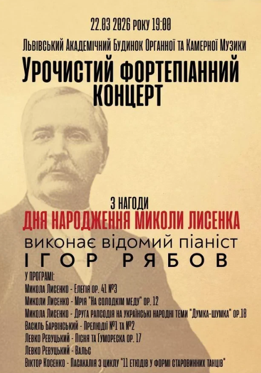 Запрошуємо на урочистий фортепіанний концерт з нагоди Дня народження Миколи Лисенка у виконанні відомого піаніста Ігоря Рябова.