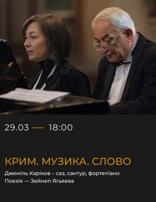 Фольклорист і композитор Джеміль Каріков представить звучання традиційних інструментів — сантур і саз. Його виконання відкриє глибинний світ кримськотатарської музики: її витоки, витончену мелодику та культурні перетини з арабською й турецькою традиціями. Акторка й філологиня Зейнеп Яг’яєва прочитає вірші кримськотатарською та українською мовами — про Крим, людей і мову, що зберігає пам'ять і силу крізь покоління.