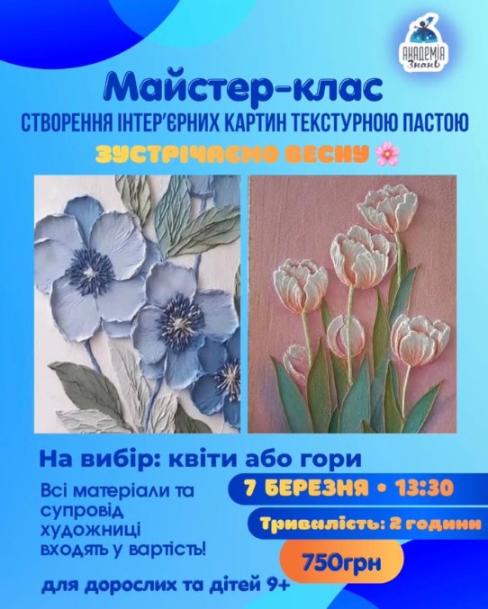 Запрошуємо дітей 9+ та дорослих на майстер-клас зі створення інтер'єрної картини текстурною пастою.