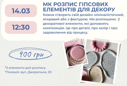 Запрошуємо на майстер-клас із розпису гіпсових елементів для декору. Кожна створить свій дизайн: мінімалістичний, яскравий або з фактурою.