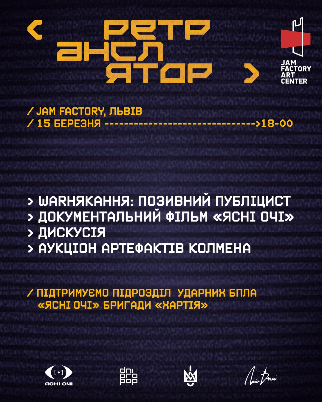 Опісля відбудеться обговорення фільму з режисером та героєм фільму й військовим підрозділу "Ясні Очі" - Євгеном Гончаровим, співзасновником лейблу Dnipropop.