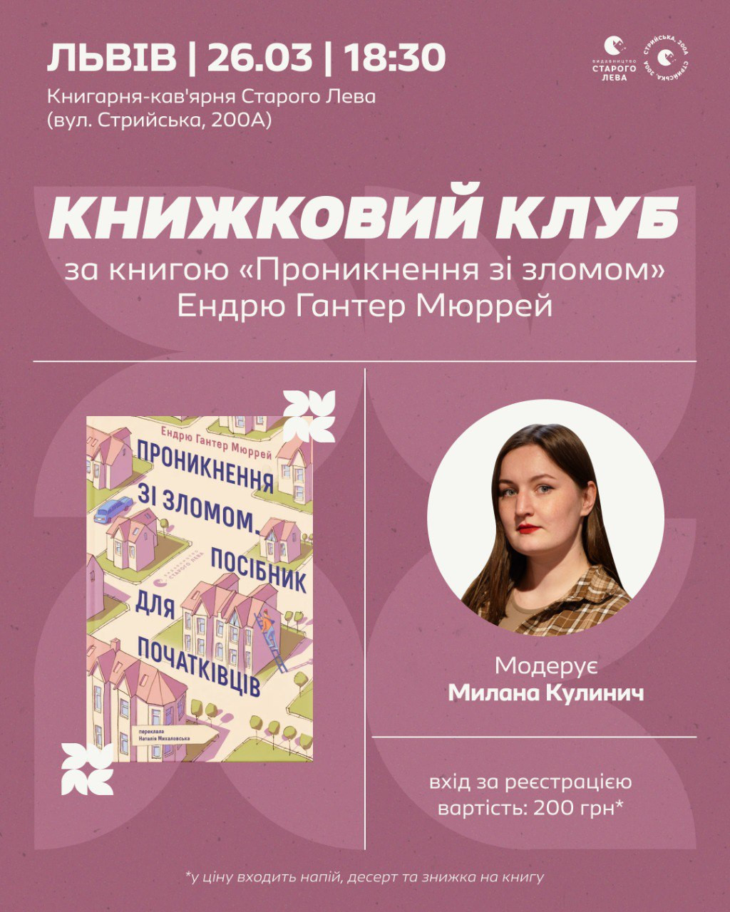 Читатимемо детектив "Проникнення зі зломом. Посібник для початківців" Ендрю Гантер Мюррей. Модеруватиме зустріч книжкова блогерка Милана Кулинич.