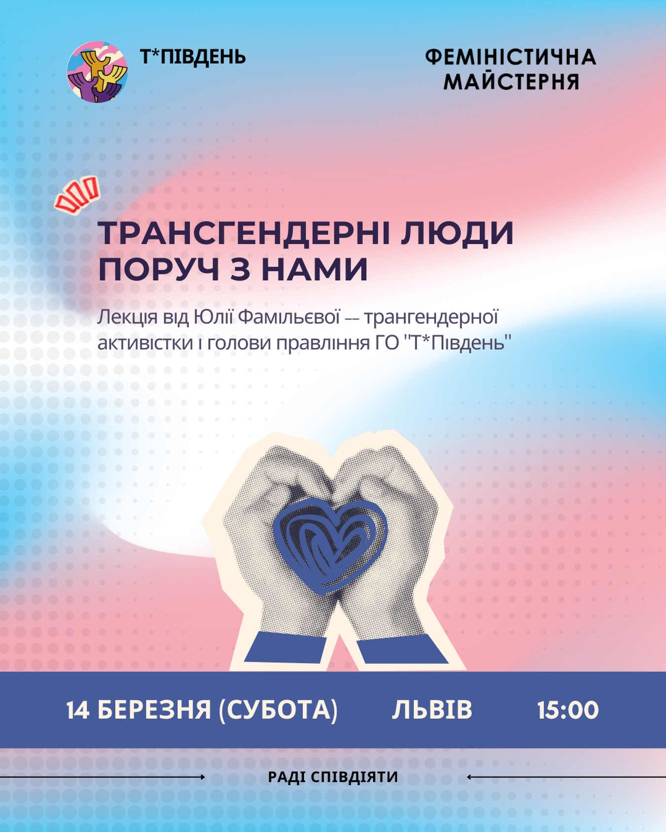Тому запрошуємо на тематичну лекцію від Юлії Фамільєвої — трангендерної активістки і голови правління ГО "Т*Південь".