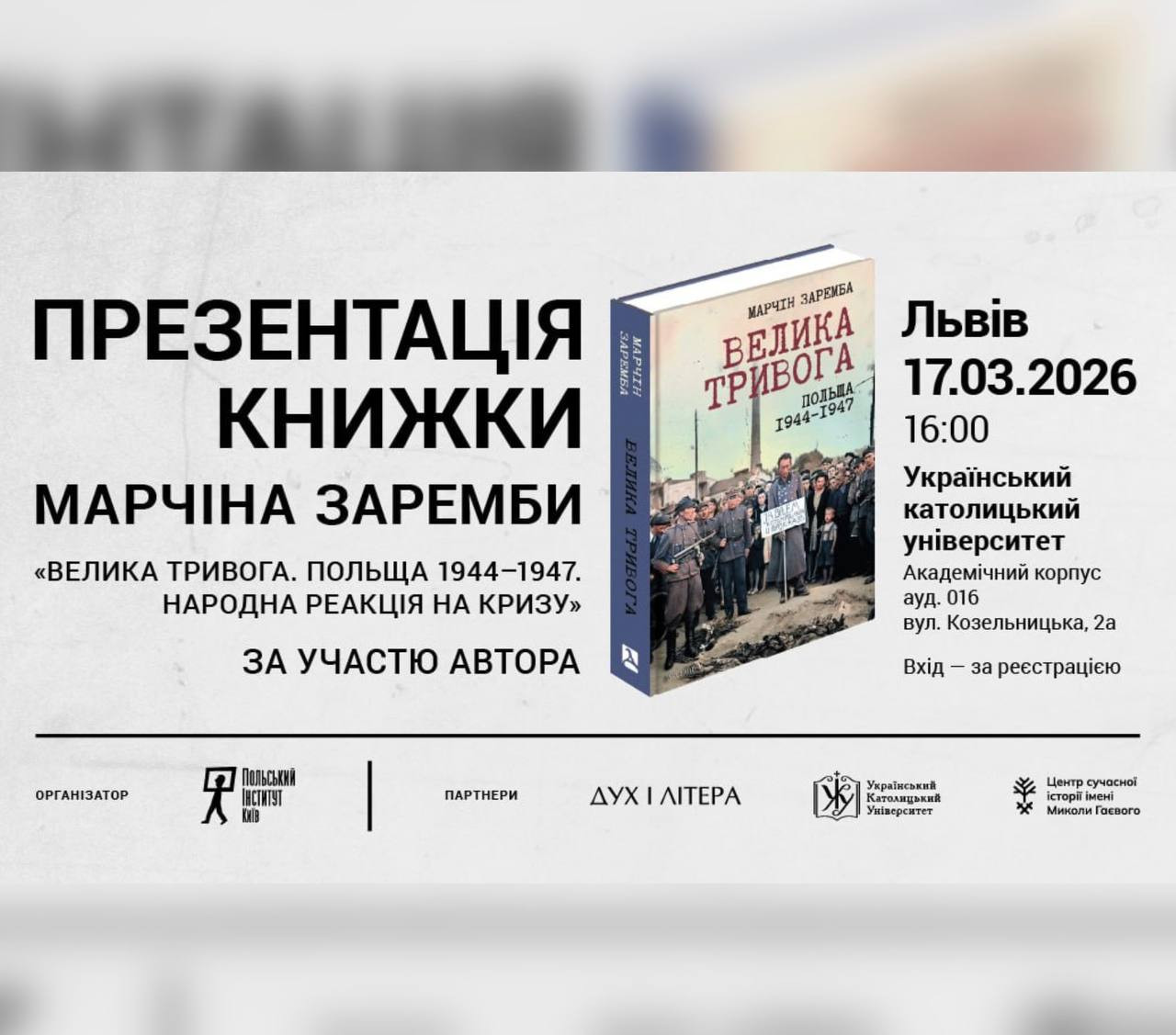 Запрошуємо на презентацію українського перекладу монографії Марчіна Заремби "Велика тривога. Польща 1944–1947. Народна реакція на кризу" за участю автора книжки.