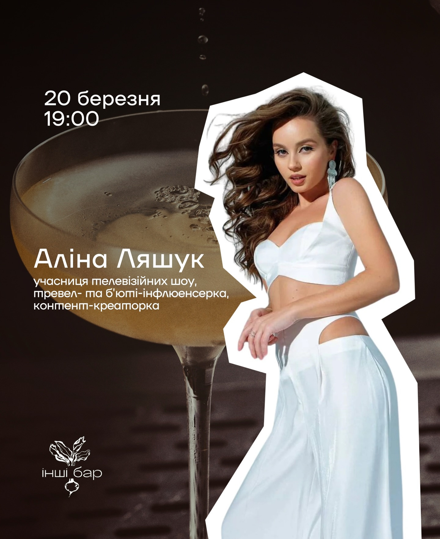 За баром Аліна Ляшук @lionilal - учасниця багатьох телевізійних шоу, тревел- та б'юті-інфлюенсерка, контент-креаторка. Її улюблений напій сухе червоне вино, а свій улюблений цього вечора можна буде знайти серед того, що для вас готуватиме @lionilal.