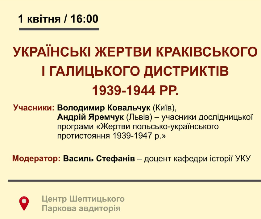 Гуманітарний факультет УКУ та кафедра історії УКУ запрошують на звітну лекцію істориків Андрія Яремчука (Львів) і Володимира Ковальчука (Київ) "Українські жертви Краківського і Галицького дистриктів 1939-1944 рр".