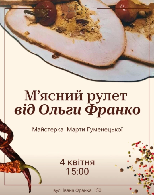Запрошуємо на гастрономічний майстер-клас, де кулінарія переплітається з пам’яттю і традицією. Разом із Мартою Гуменецькою — праправнучкою Івана Франка — будемо готувати великодній рулет з індички за рецептом її бабусі, знаної кулінарки Ольги Франко.