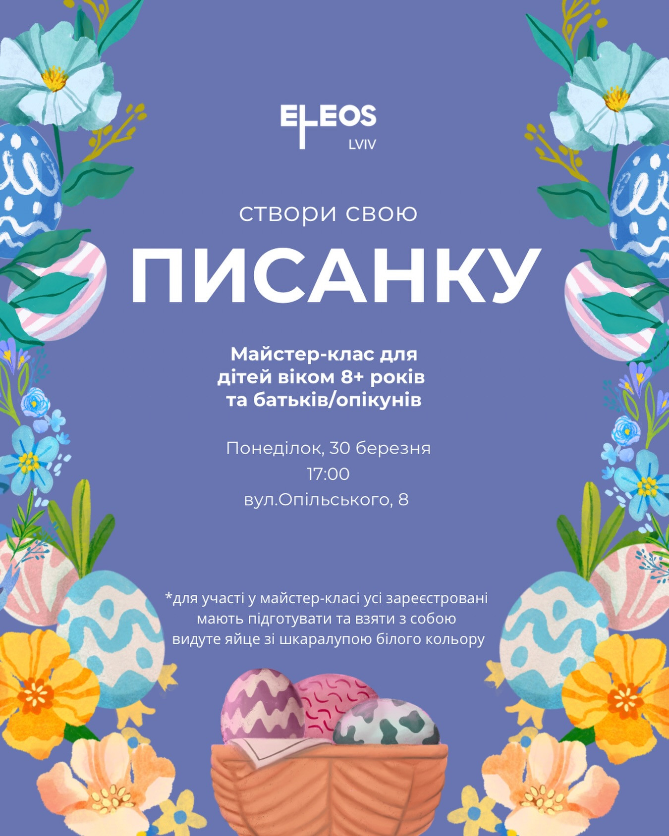 Запрошуємо дітей та їхніх батьків/опікунів на майстер-клас зі створення писанки.