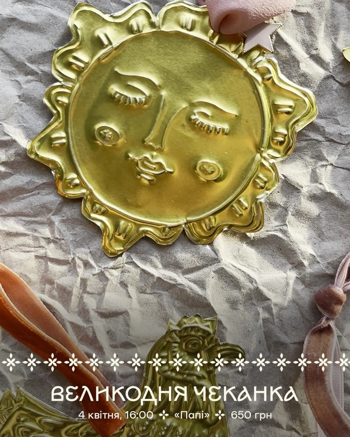 Запрошуємо на майстер-клас "Великодня Чеканка". Це творче заняття, де учасники створюють святковий декор (зазвичай металеві писанки або панно) у давній техніці художньої обробки металу.