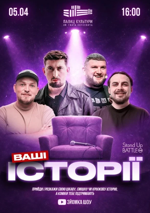 Ось тепер є шанс розповісти її зі сцени. "Ваші Історії" — це новий формат, де будь-хто з вас може потрапити до випуску зі своєю кумедною, абсурдною або просто дуже життєво-смішною історією.