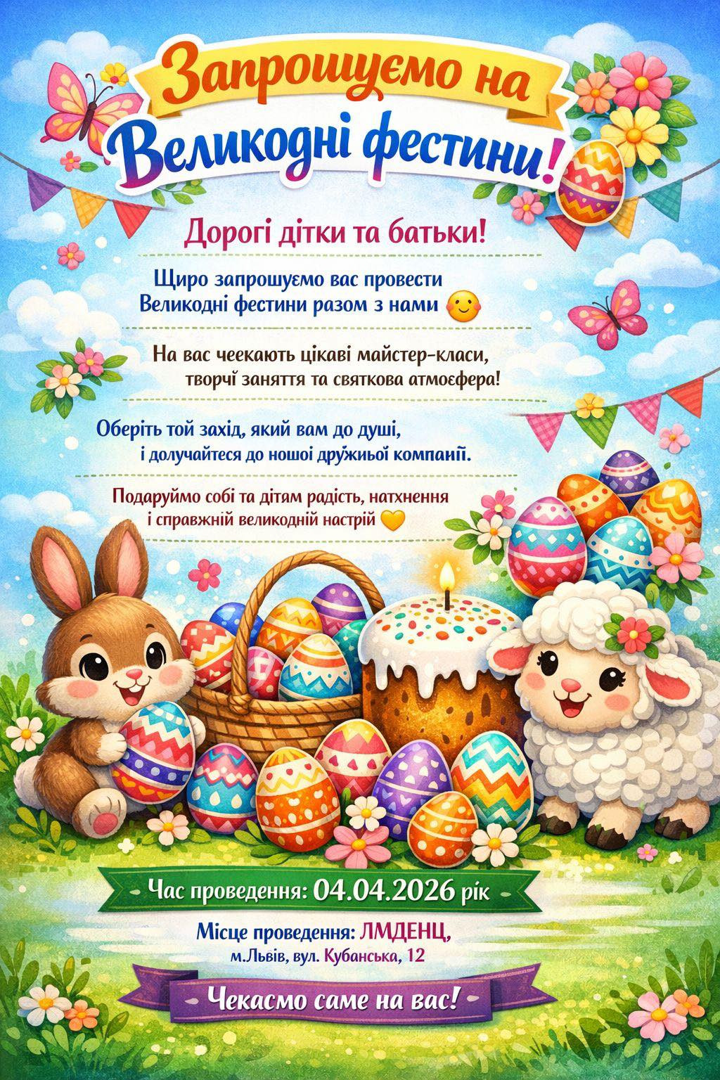 Дорогі дітки та батьки, щиро запрошуємо вас провести Великодні фестини разом з нами.
