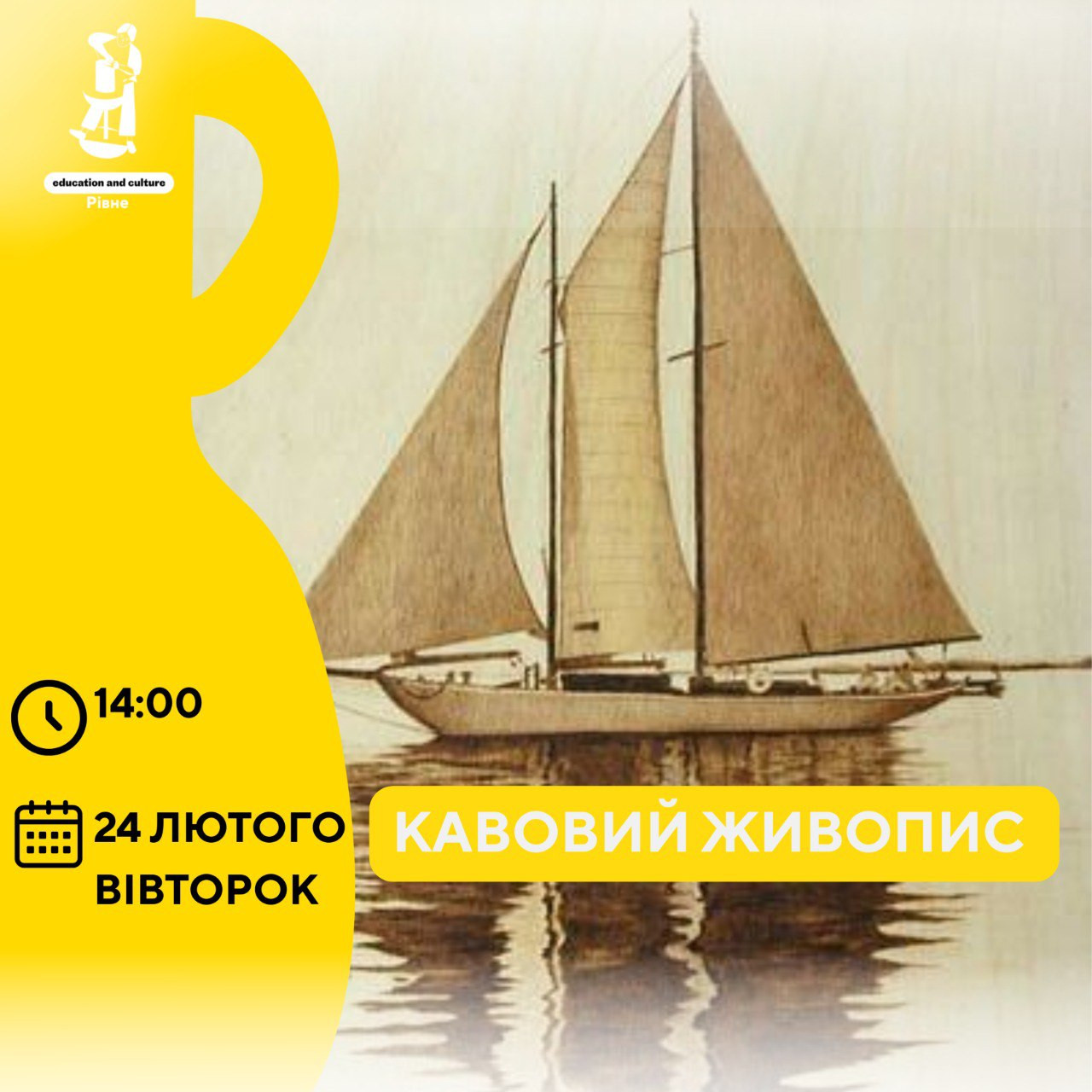Під менторством художниці Наталії Томчук будемо працювати з теплими кавовими тонами, передавати світло й віддзеркалення на воді.