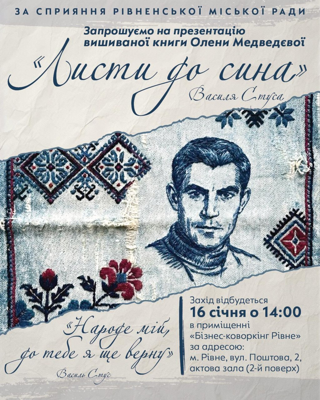 Олена Медведєва запрошує вас на презентацію вишиваної книги ""Листи до сина" Василя Стуса".