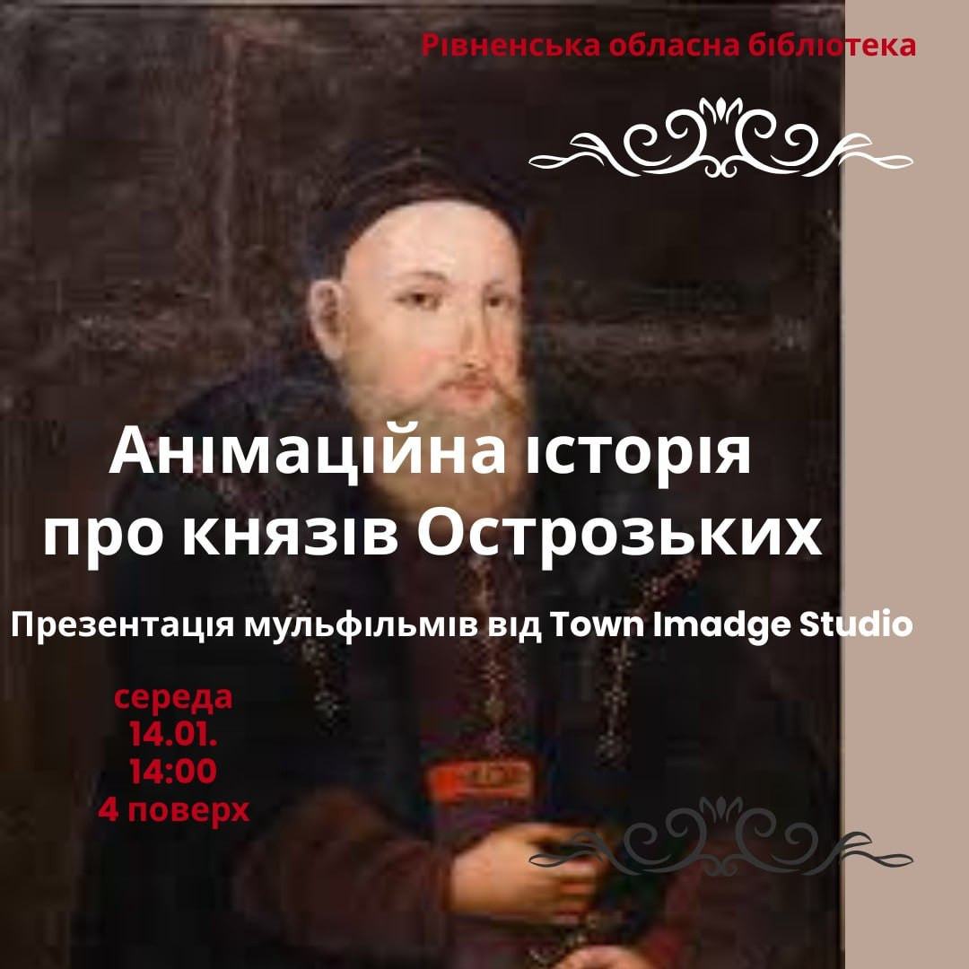 Запрошуємо на зустріч з історією! Уже цієї середи для вас відбудеться презентація анімаційної історії про князів Острозьких, яка присвячена 500-річчю від дня народження князя Костянтина-Василя Острозького, військового, політичного, культурного та релігійного діяча.
