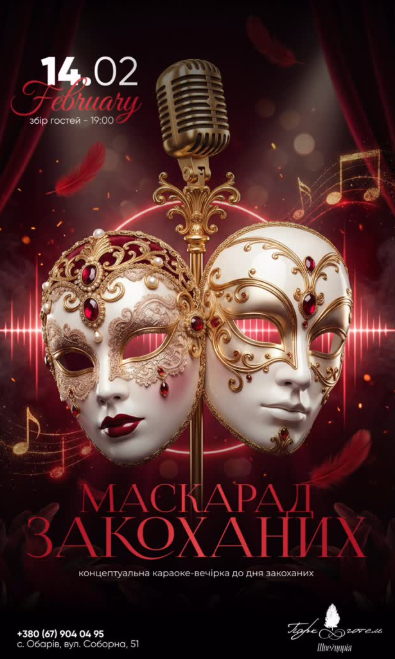 Концептуальна караоке-вечірка до Дня закоханих: маски, червоне світло, сцена, емоції — і твоя пісня, яку неможливо підробити.