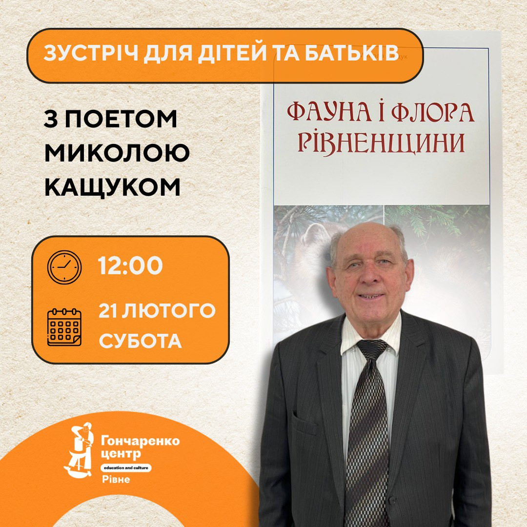 Запрошуємо дітей та батьків на теплу й пізнавальну зустріч із поетом Миколою Кащуком.