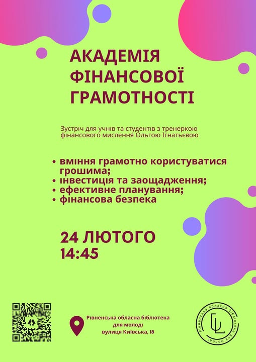 У відділі сімейного читання Рівненської обласної бібліотеки для молоді відбудеться чергове засідання "Академії фінансової грамотності" з тренеркою фінансового мислення Ольгою Ігнатьєвою.