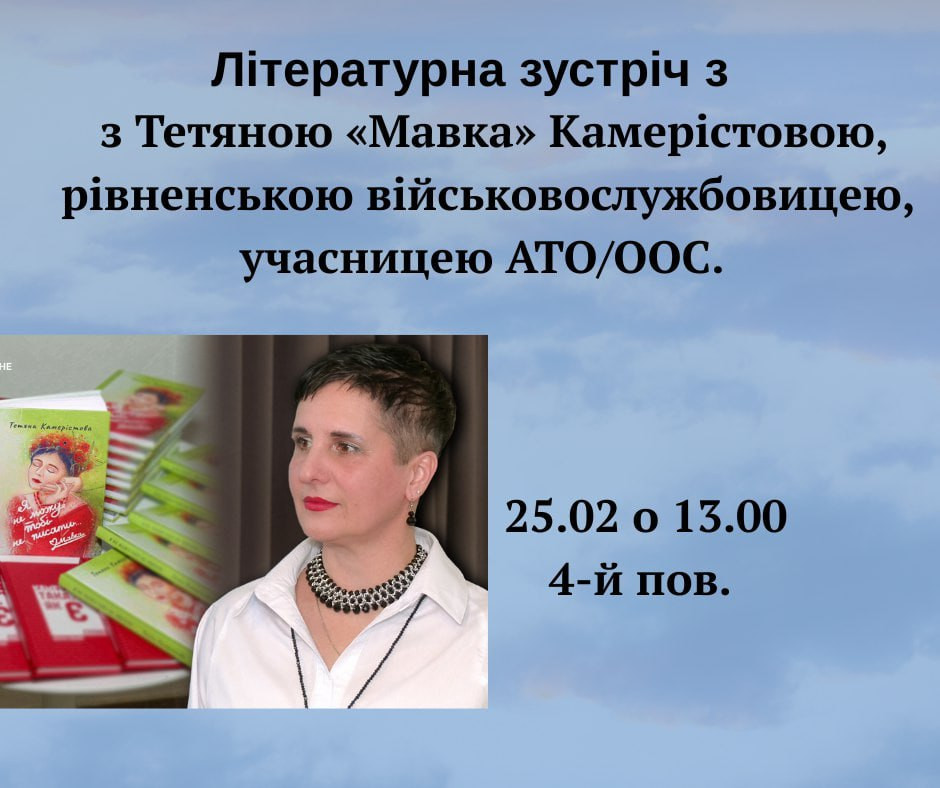 Запрошуємо на особливу зустріч із поетесою та військовослужбовицею, учасницею АТО/ООС Тетяною Камерістовою.