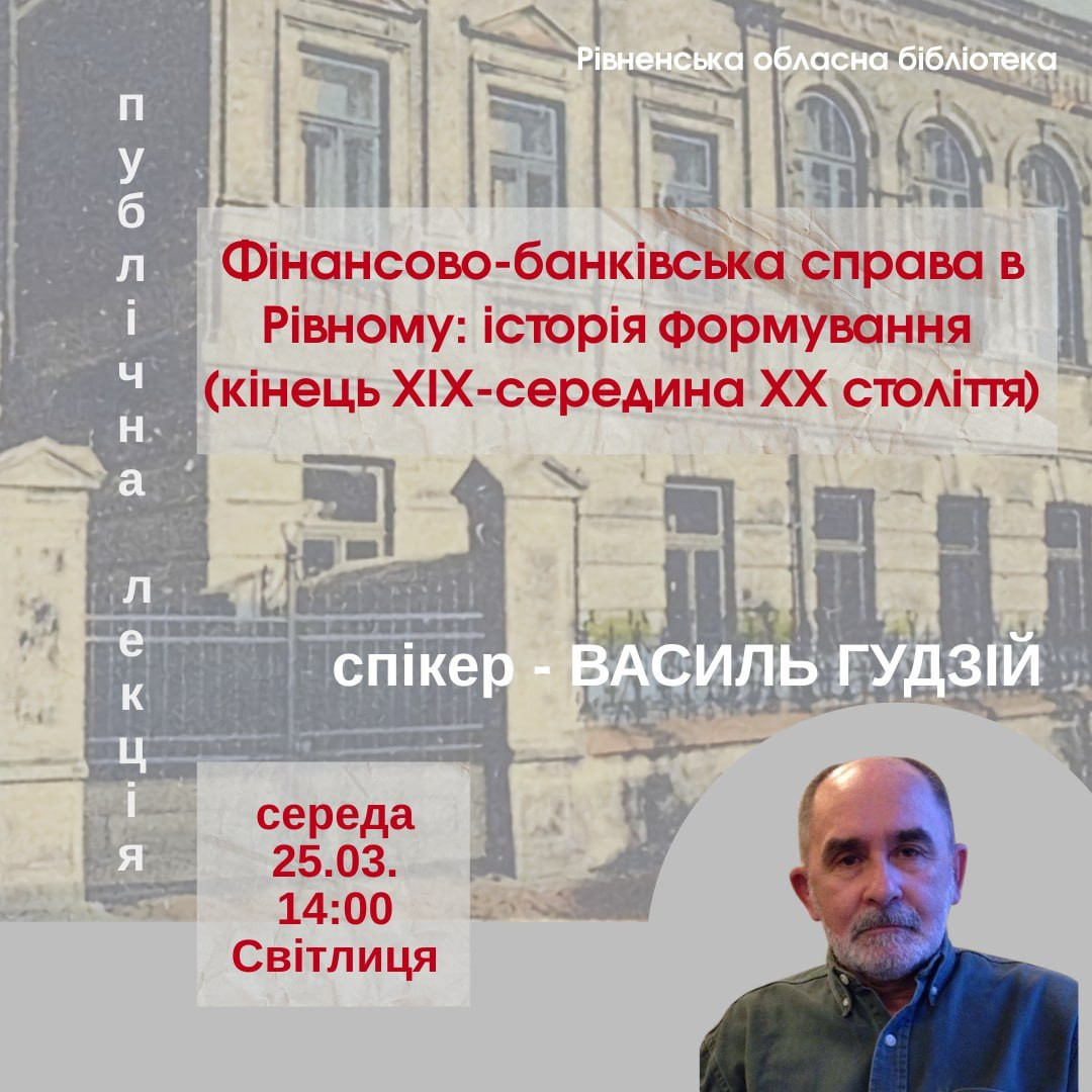 Запрошуємо вас на нову лекцію відомого рівненського краєзнавця Василя Гудзія "Фінансово-банківська справа в Рівному:історія формування (кінець XIX – середина XX ст.)"
