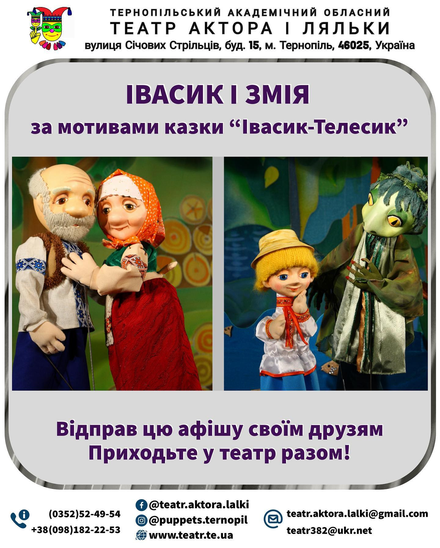 "Жили собі Дід і Баба. Жили вони в любові та злагоді. Та от біда, не було в них діток...", - так розпочинається одна з улюблених українських народних казок "Івасик-Телесик". Мабуть, кожному з нас розповідали її. І цього дня вона оживе на сцені нашого театру.