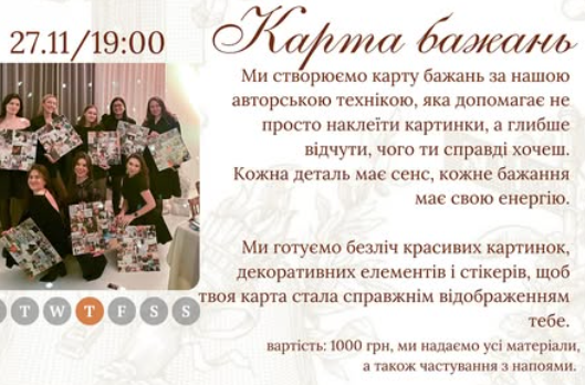 Ми створюємо карту бажань за нашою авторською технікою, яка допомагає не просто наклеїти картинки, а глибше відчути, чого ти справді хочеш.