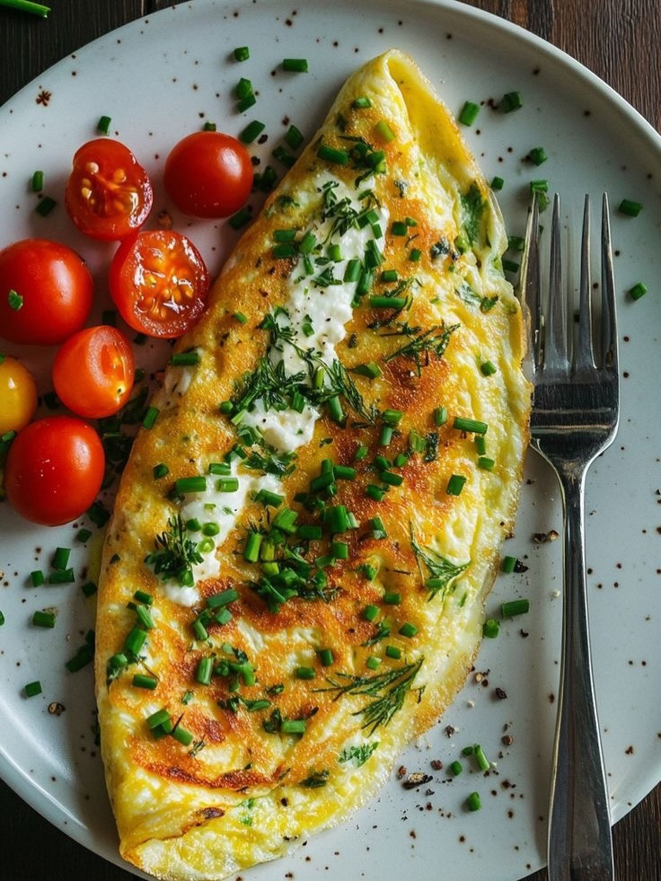 Пухкий омлет з креветками - ніжні соковиті креветки, ароматні в'ялені томати, свіжий шпинат і вершкова текстура — ідеальний початок дня.