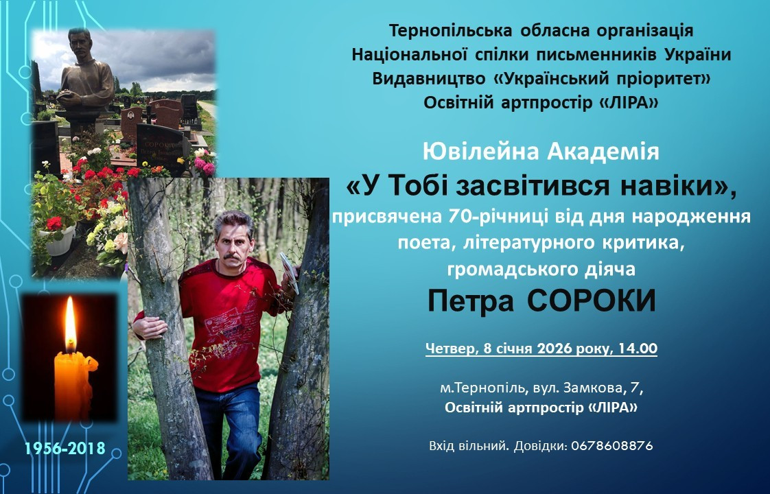 Тернопільська обласна організація Національної спілки письменників України, видавництво "Український пріоритет" та Освітній артпростір "ЛІРА" запрошують на Ювілейну Академію "У Тобі засвітився навіки", яка присвячена 70-річниці від дня народження поета, літературного критика, громадського діяча Петра СОРОКИ.