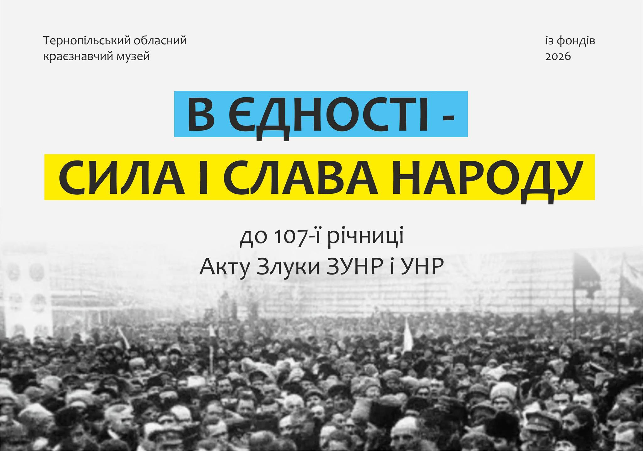 Запрошуємо до музею на виставку "В єдності — сила і слава народу", присвячену 107-й річниці Акта Злуки ЗУНР і УНР. Це нагода ще раз згадати подію, яка стала символом прагнення українців до єдності, державності й спільного майбутнього.