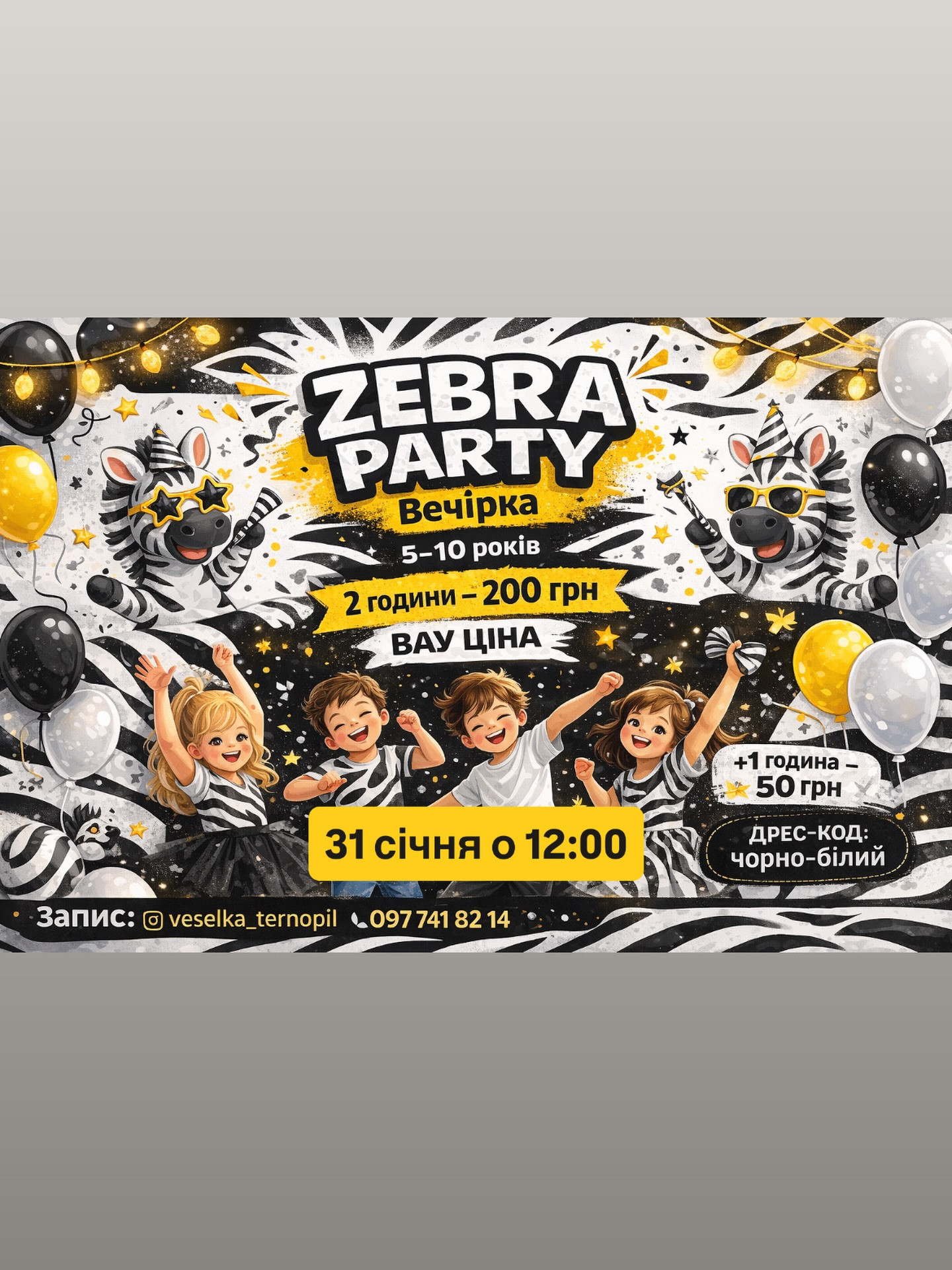 Запрошуємо діток на яскраву Zebra Party — веселу подію для всіх, хто любить зебр і чорно-білий стиль. Під час перебування на дітей чекає розважальна програма, солодкий перекус та творчий майстер-клас.