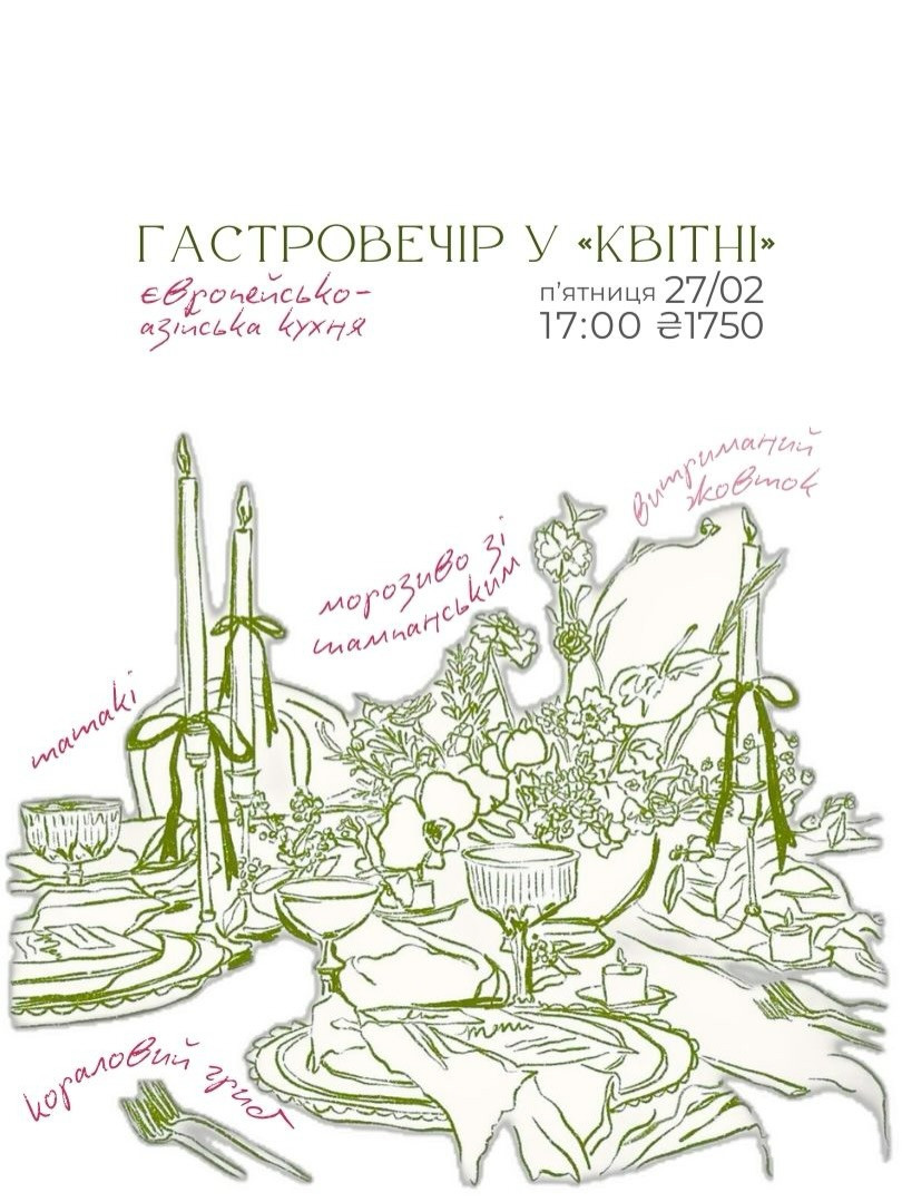 Камерна вечеря для поціновувачів, яка здивує. У меню цього разу – від стартеру до десерту – європейсько-азійська кухня: бао булочки та кораловий гриб, компресована вишня і витриманий жовток, а ще… (тримаємо інтригу).
