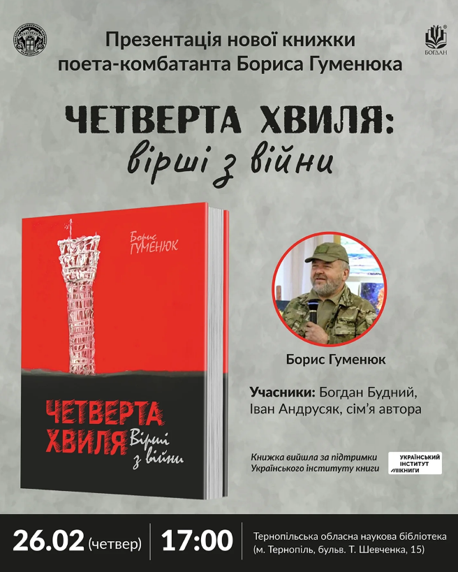Запрошуємо на презентацію поетичної збірки поета-комбатанта Бориса Гуменюка "Четверта хвиля: вірші з війни".