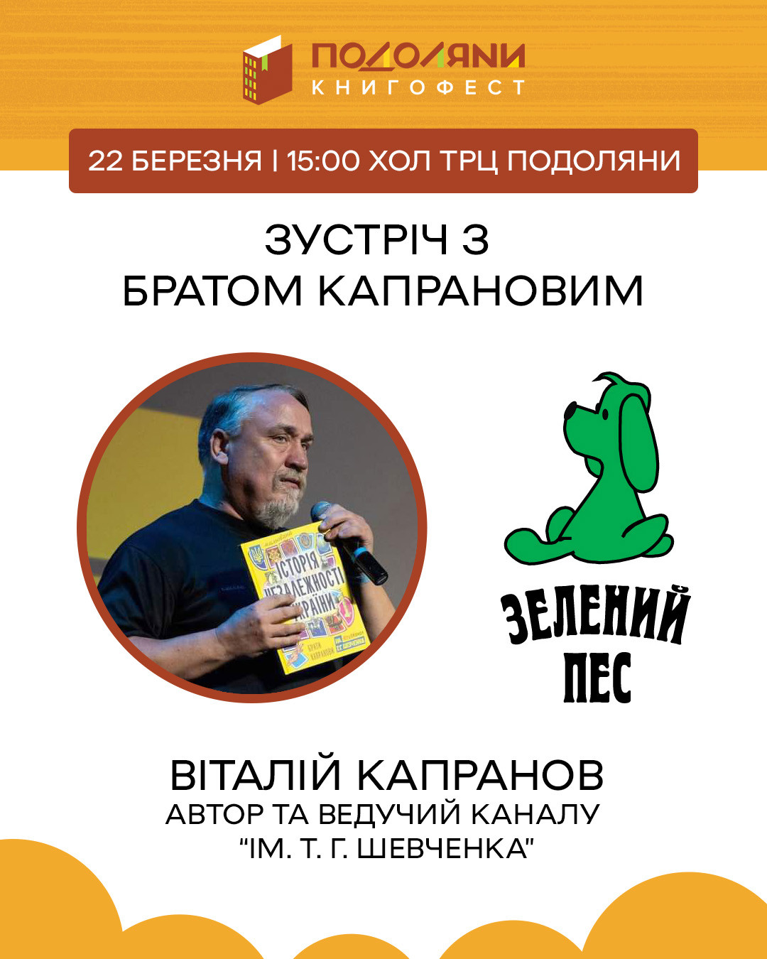 Зустріч із Братом Капрановим — письменником, публіцистом і ведучим каналу "ім. Т. Г. Шевченка". Автор поділиться своїми думками про роль культури в часи змін, розповість про власні творчі проєкти та бачення української ідентичності. Живий діалог, глибокі теми й актуальні роздуми у форматі змістовної бесіди
