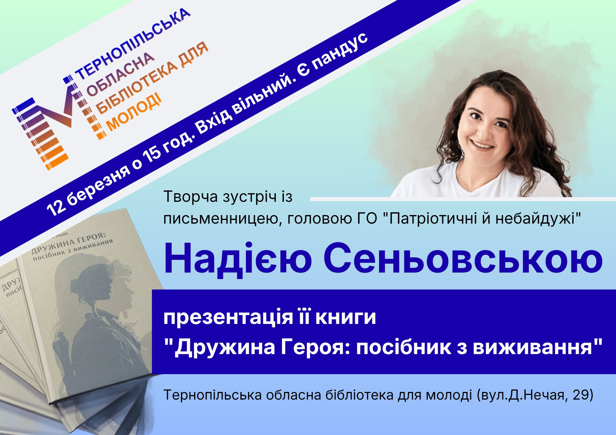 У літературному просторі "Читай! Мрій! Дій!" Тернопільської обласної бібліотеки для молоді відбудеться творча зустріч із письменницею, освітянкою, головою громадської організації "Патріотичні й небайдужі" Надією Сеньовською та репрезентація її книги "Дружина героя: посібник з виживання".