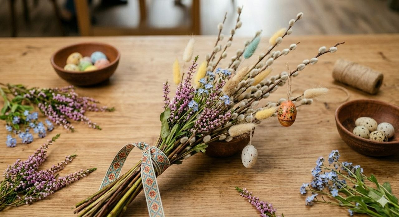 На майстер-класі будемо створювати ніжний весняний букетик із вербових гілочок, пухнастих колосків, декоративних квітів і стрічок. Такий декор стане чудовою прикрасою і символом Вербної Неділі.