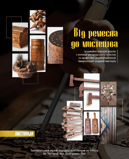 Маємо честь запросити вас на виставку "Від ремесла до мистецтва", що презентує унікальні зразки традиційного народного дерева з колекції Закарпатського музею народної архітектури та побуту, а також професійне дереворізьблення Закарпатської академії мистецтв. Це подія, яка поєднує спадщину та сучасне бачення, демонструє красу ручної праці та мистецьку майстерність, що передається поколіннями.