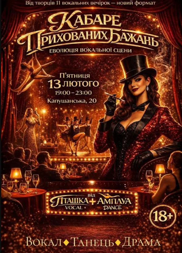 "Кабаре прихованих бажань" — еволюція вокальної сцени: вокал, танець і драматургія об'єднані в єдину дію. Це кабаре, де історія розповідається голосом і тілом, світлом і паузами. Монологи, репліки й пісні існують поруч із пластикою танцю та музикою.