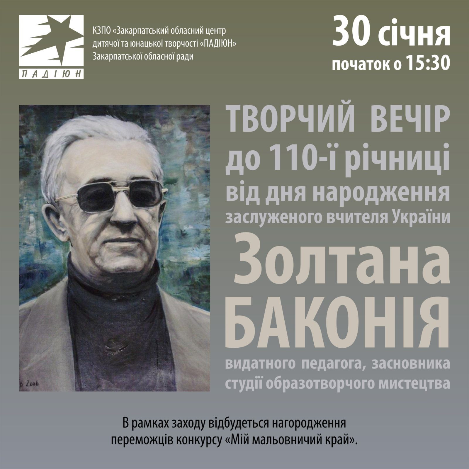 Запрошуємо на творчий вечір, присвячений 110-й річниці від дня народження З. С. Баконія - видатного педагога, засновника студії образотворчого мистецтва.