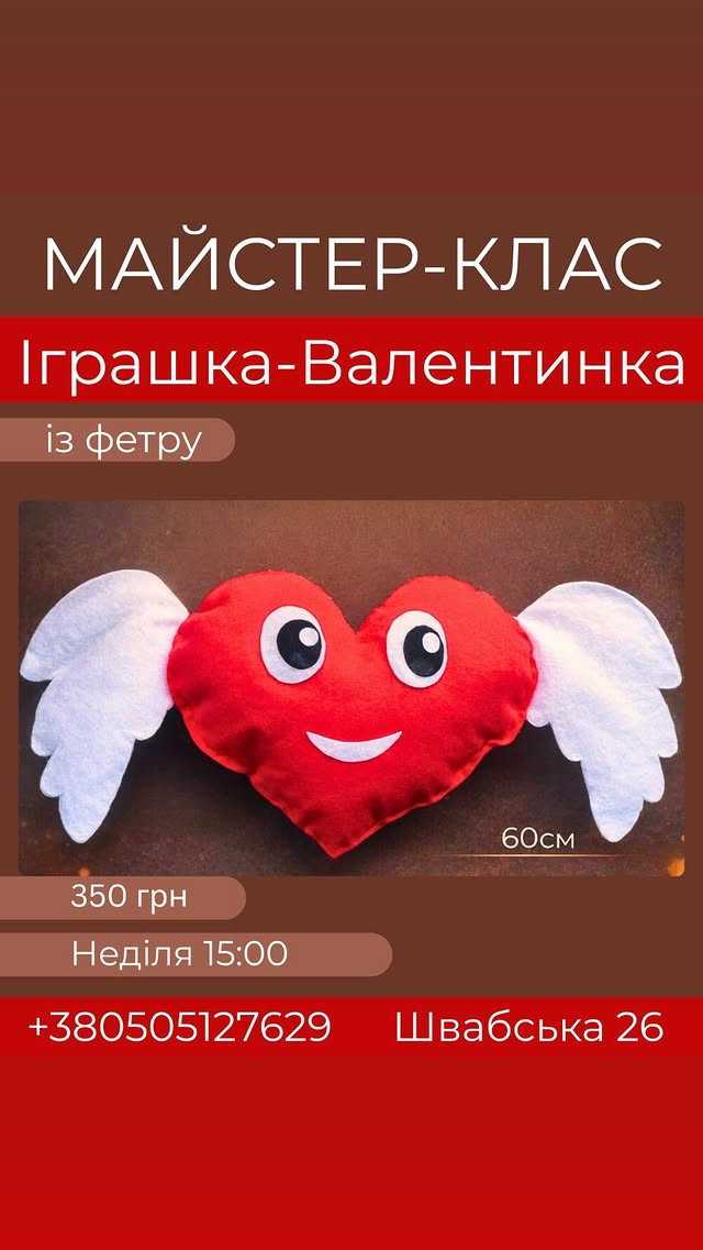 Під час заняття ви власноруч створите велику м'яку іграшку-сердечко з фетру, навчитеся працювати з матеріалом та декоративними елементами.