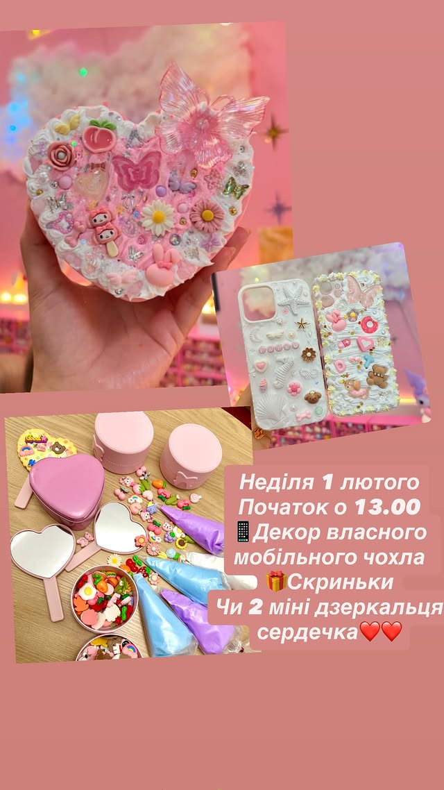 Запрошуємо на яскравий творчий майстер-клас, де ви зможете задекорувати на вибір: мобільний чохол, стильну скриньку або два милі дзеркальця у формі сердечка.