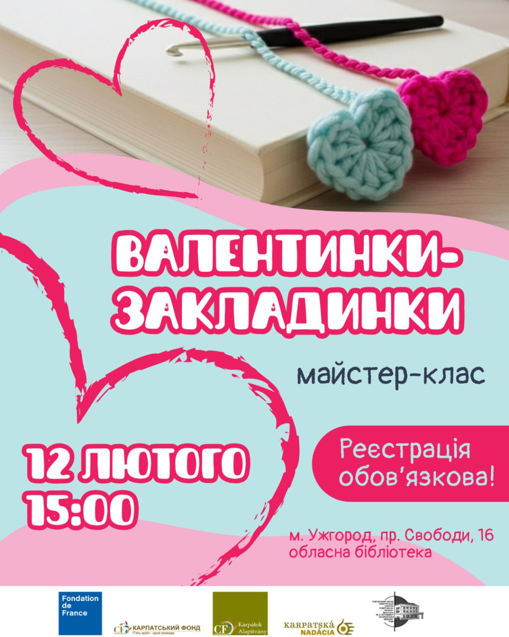 Запрошуємо дорослих і дітей від 12 років на творчу зустріч, де кожен зможе зв'язати для себе чи для своєї половинки валентинку-закладку.