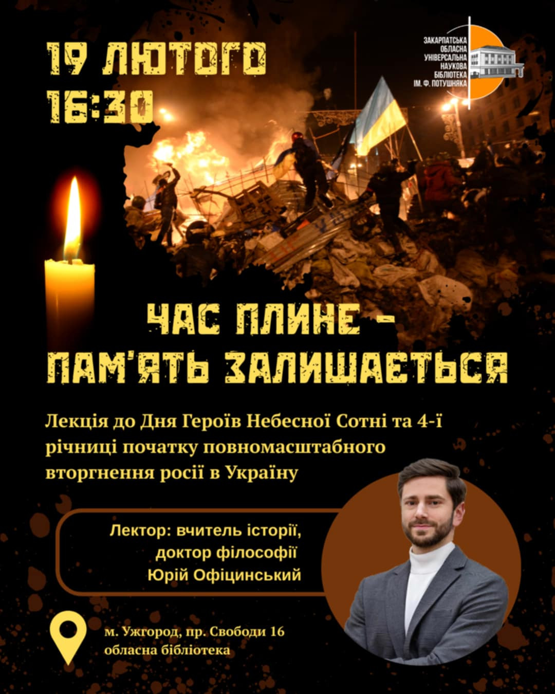 В цей четвер запрошуємо вас на лекцію до Дня Героїв Небесної Сотні та до 4-ї річниці початку повномасштабного вторгнення росії в Україну.