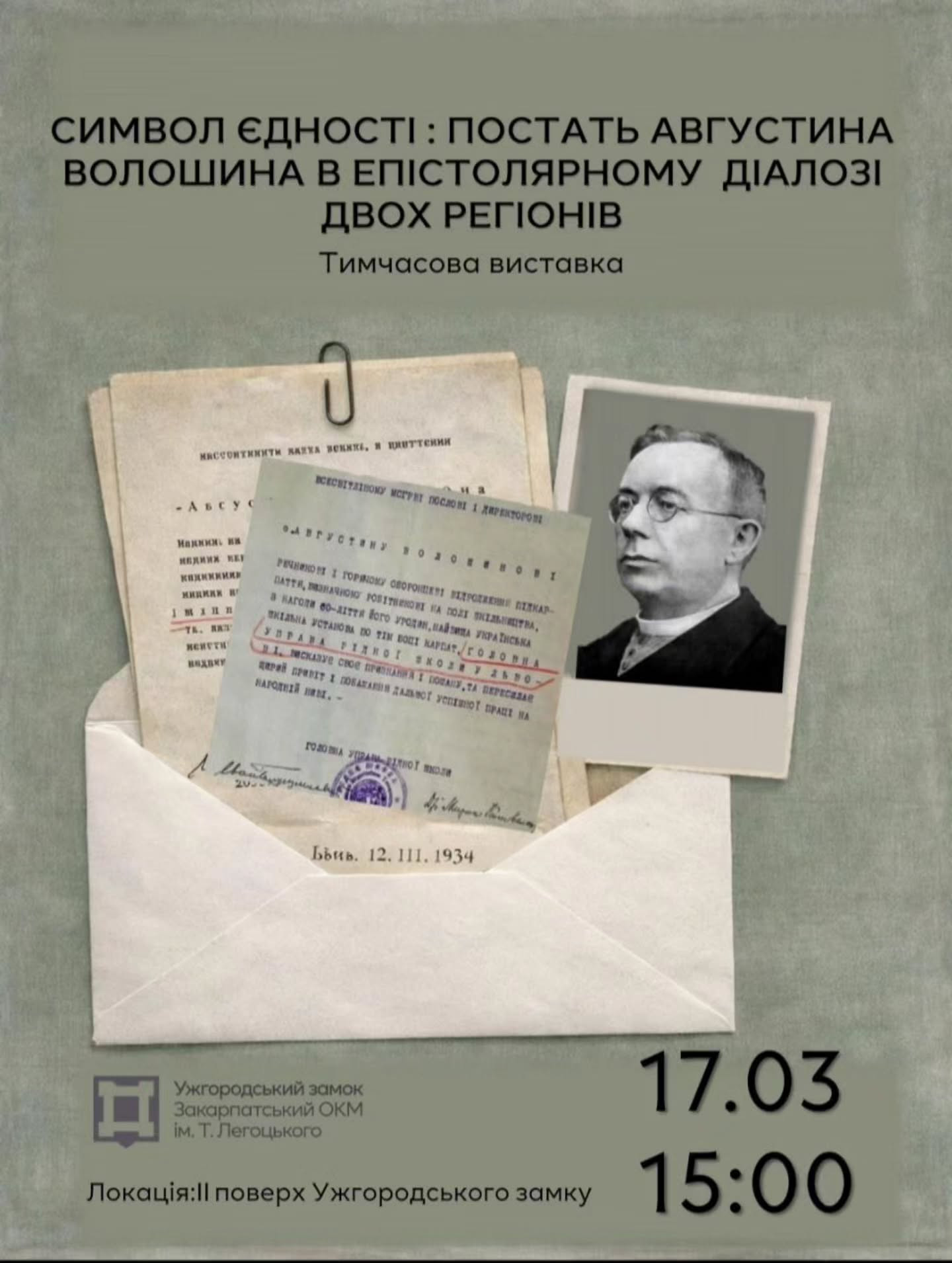 Запрошуємо на відкриття тимчасової виставки, присвяченої видатному громадському, політичному та культурному діячеві — Августин Волошин, чия діяльність стала важливою частиною української історії першої половини ХХ століття.