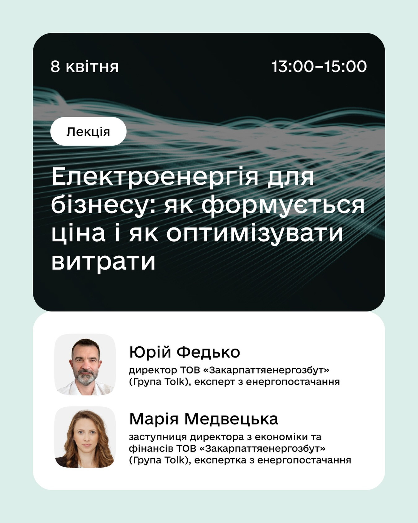Запрошуємо на лекцію, де разом із фахівцями енергопостачальної компанії в Закарпатській області розберемо, як працює ринок електроенергії для бізнесу та які рішення допомагають оптимізувати витрати. Поговоримо про споживання, облік, ціноутворення та реальні кейси, які вже допомагають бізнесу економити.