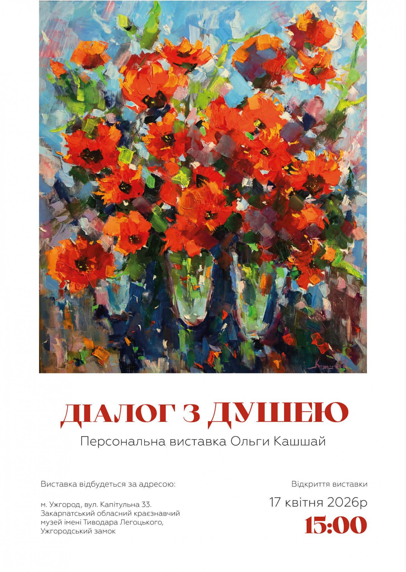 Запрошуємо на відкриття персональної виставки "Діалог з душею" відомої художниці, членкині Національної спілки художників України, лауреатки премії імені Тетяни Яблонської Ольги Кашшай.