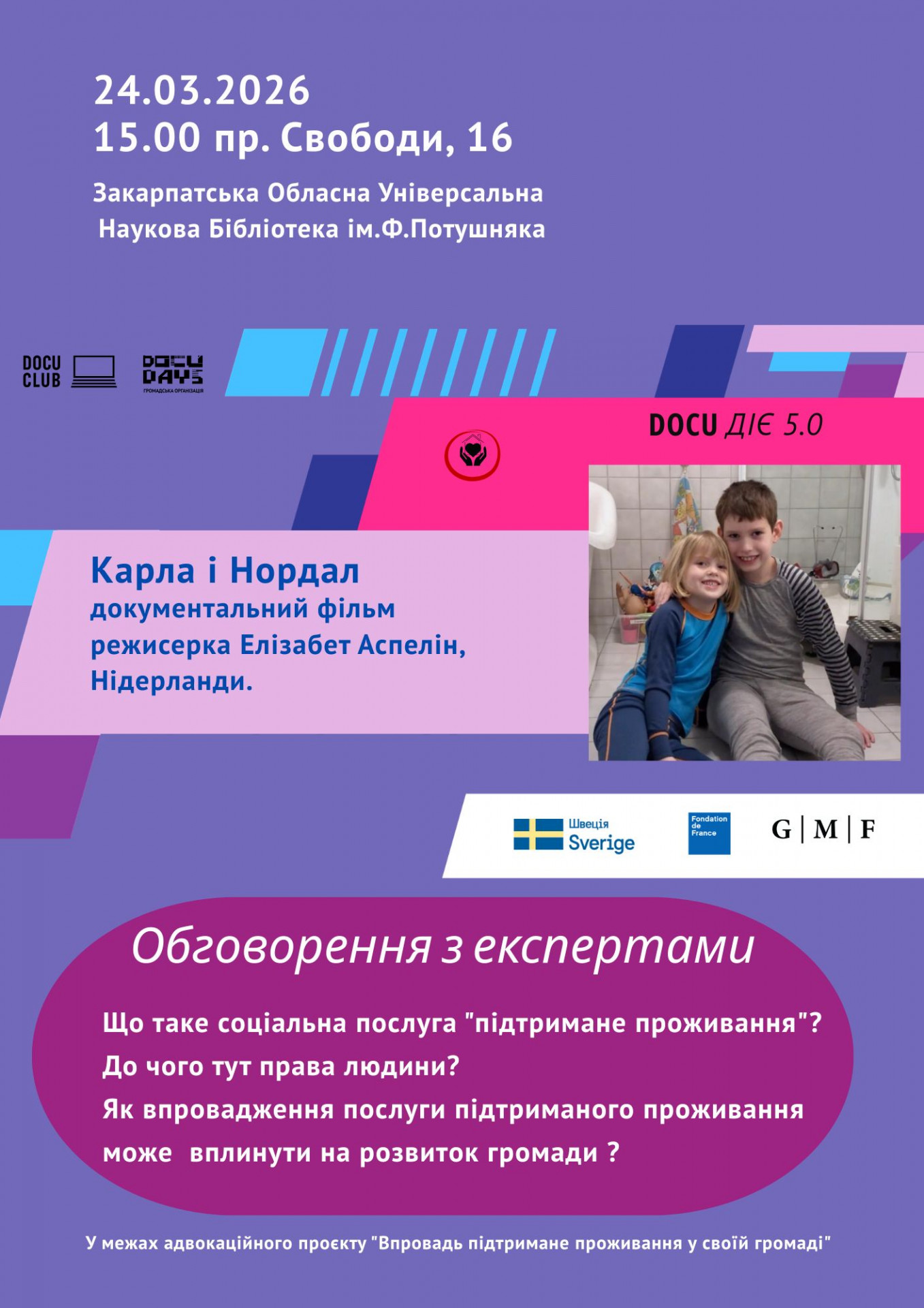 Запрошуємо всіх охочих на показ-обговорення документального фільму "Карла і Нордал" (режисерка Елізабет Аспелін, Нідерланди, 19 хв.) у межах адвокаційного проєкту "Впровадь підтримане проживання у своїй громаді".