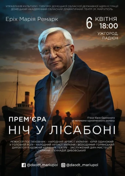 Ми знаємо сьогодні, як звучить сирена, як боляче від розлуки. Знаємо, що таке евакуація, як це - вціліти. Як важливо говорити, коли здається, що вже все сказано. Донецький театр (м. Маріуполь) - #ТЕАТРбезДАХУ - представляє одну із найсильніших історій XX століття. Еріх Марія Ремарк "Ніч у Лісабоні".