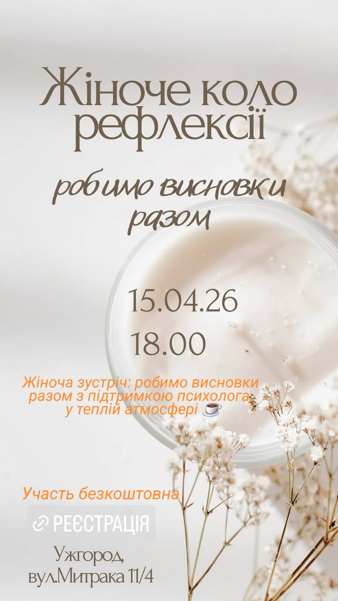Запрошуємо на жіноче коло рефлексії — зустріч, де можна зупинитися, подивитися на свій досвід по-новому та зробити важливі висновки.