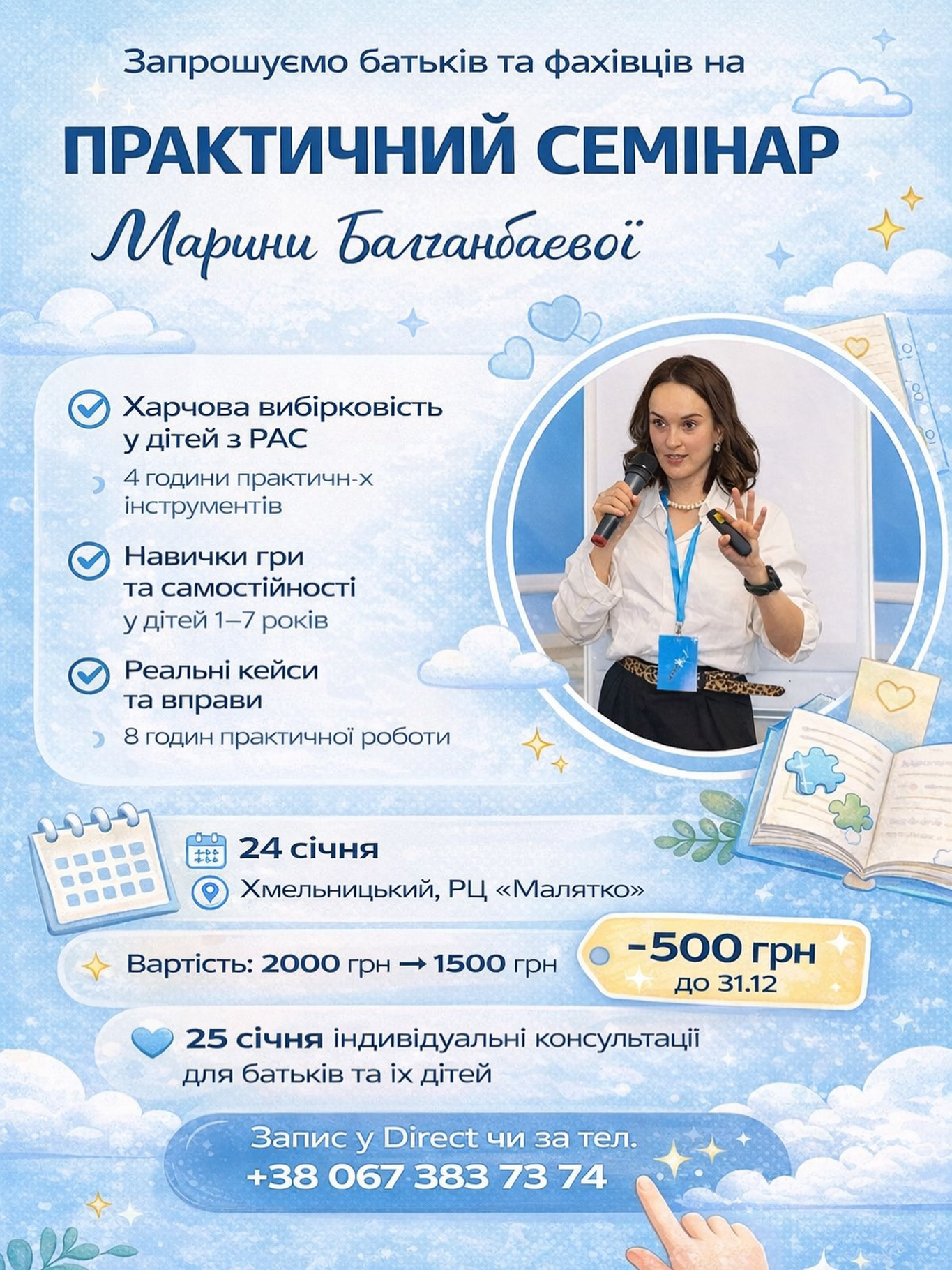 Запрошуємо батьків та фахівців на практичний семінар від Марини Балганбаєвої — фахівчині з АВА-терапії, BCBA, IBA, ESDM-терапістки та коуча батьків.