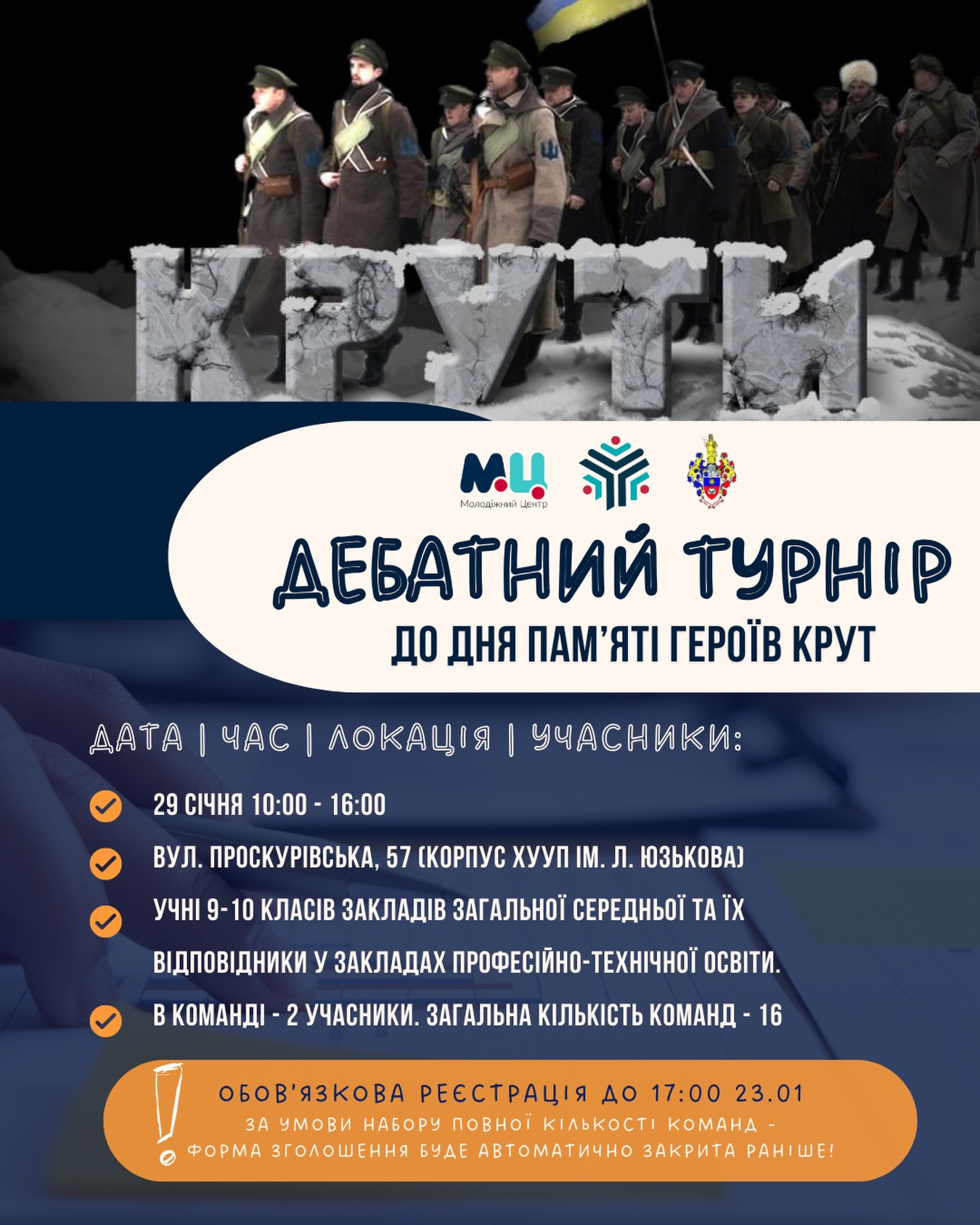 КУ "Молодіжний центр" спільно з Молодіжною радою Хмельницького та Хмельницьким університетом управління та права ім. Л. Юзькова організовує дебатний турнір до 108-ї річниці бою під Крутами для активної учнівської молоді Хмельницького.