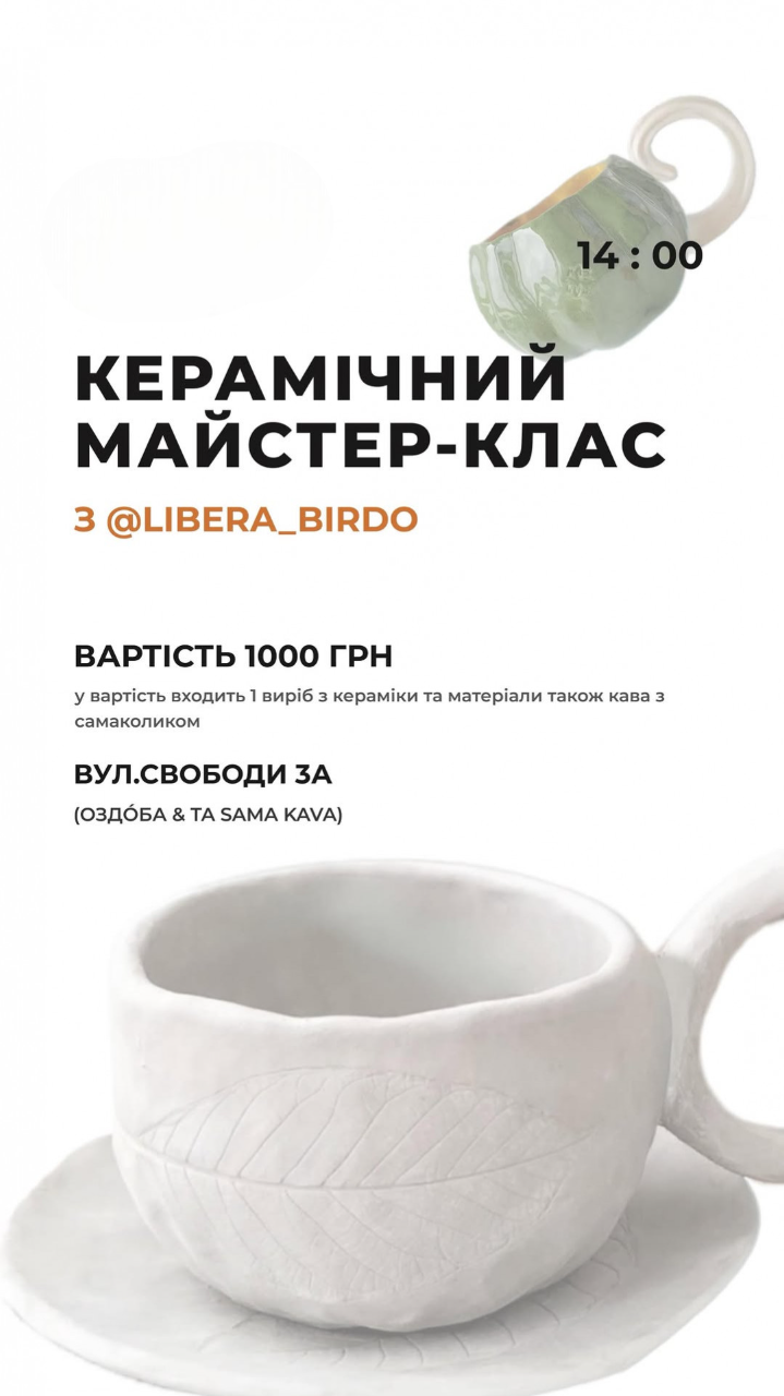 У вартість входить 1 виріб з кераміки та матеріали, а також кава з смаколиками.